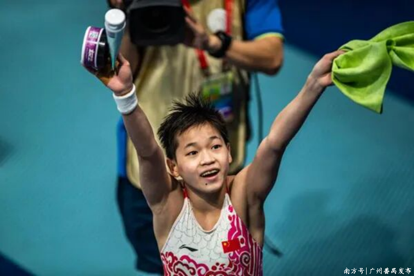 2021年9月12日,广东队选手全红婵在比赛后向观众微笑致意,她以419.25分的总成绩获得冠军。当日,十四运会跳水女子10米台决赛在西安举行。新华社记者 陶亮 摄